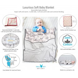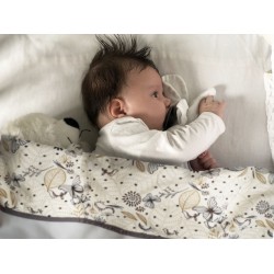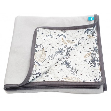 Rectangle-shaped throw blanket for newborn baby. Birds and leafs printed cotton on the inside.
